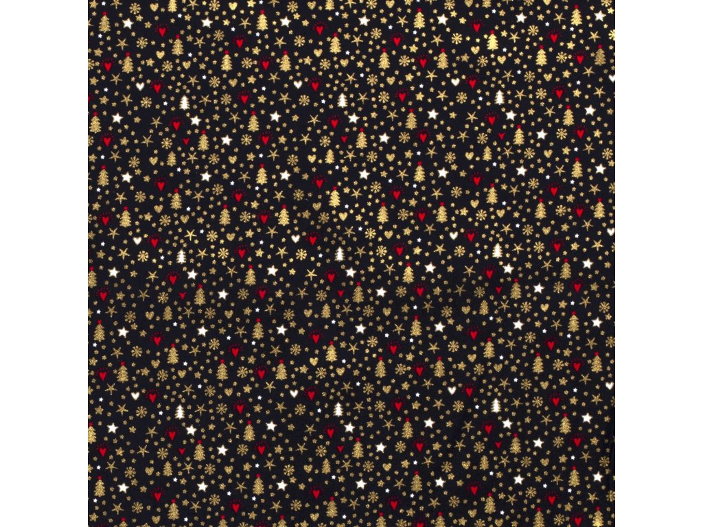 Plátno má všestranné využití - oděvní i dekorační. Ušít si můžete sukni, šaty, polštářky, závěsy...Jedná vánoční kolekci se zlatým tiskem. Ten na povrchu látky prakticky není cítit, tudíž se nespere. nejedná se ani o třpytky. Velmi příjemná, měkká látka.