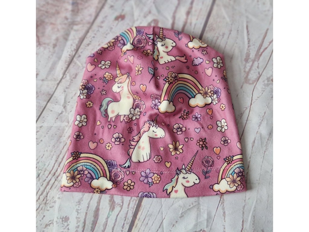 Flísová čepice Yháček, jednovrstvá, Jednorožci na starorůžové