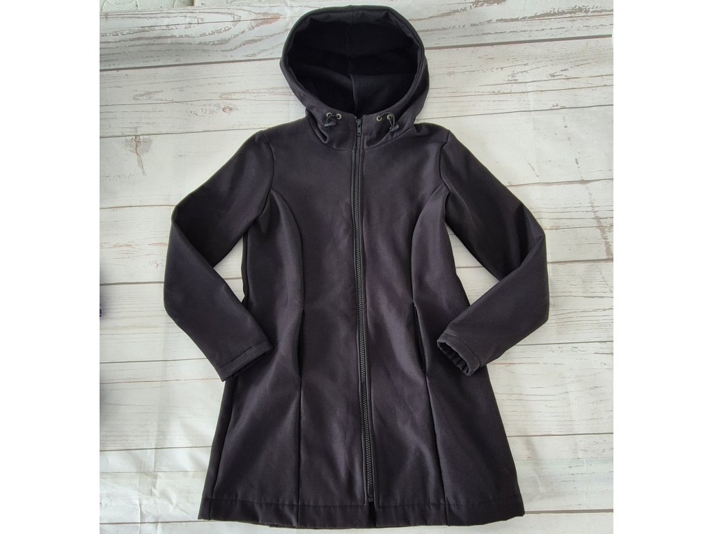 Černý softshellový kabát Yháček. Příjemný softshell s flísem z rubu. Má kapsy na zip a stahovací kapucku. Je vhodný spíše pro hubenější dívku.