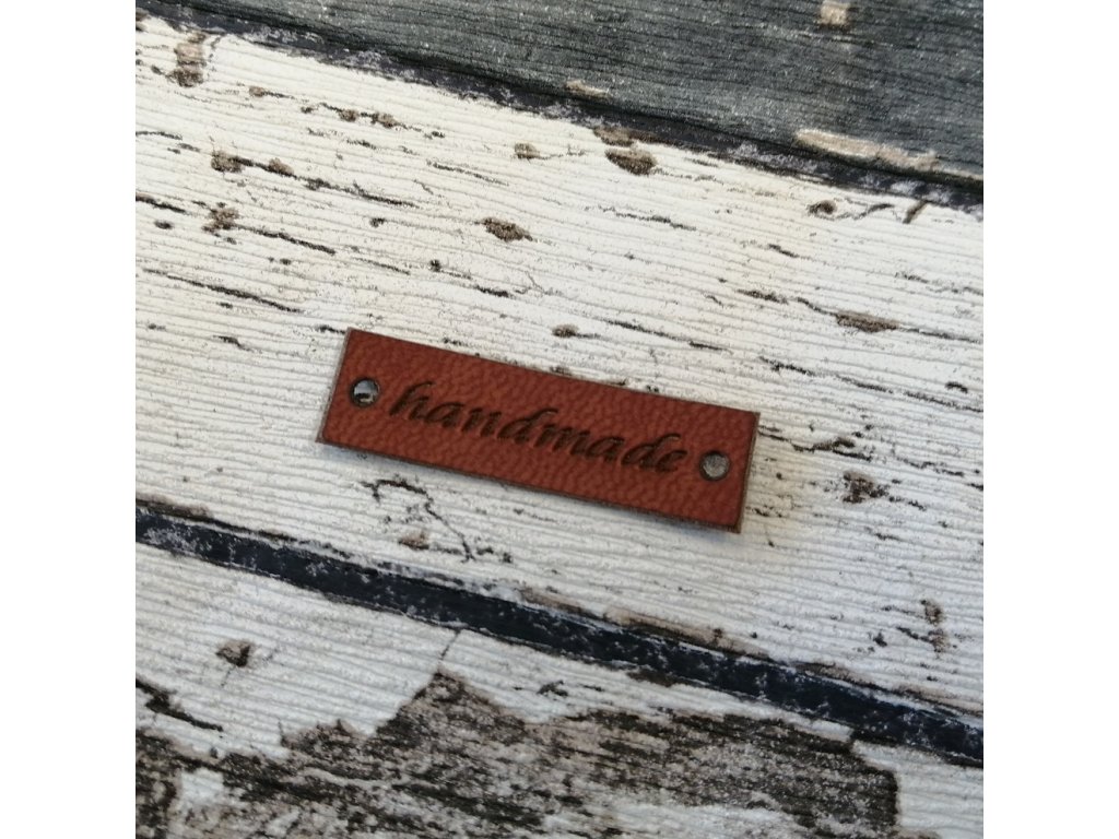 Štítek z ekokůže s vytlačeným nápisem Hand made. Dvě dírky k přišití k vlastní tvorbě.