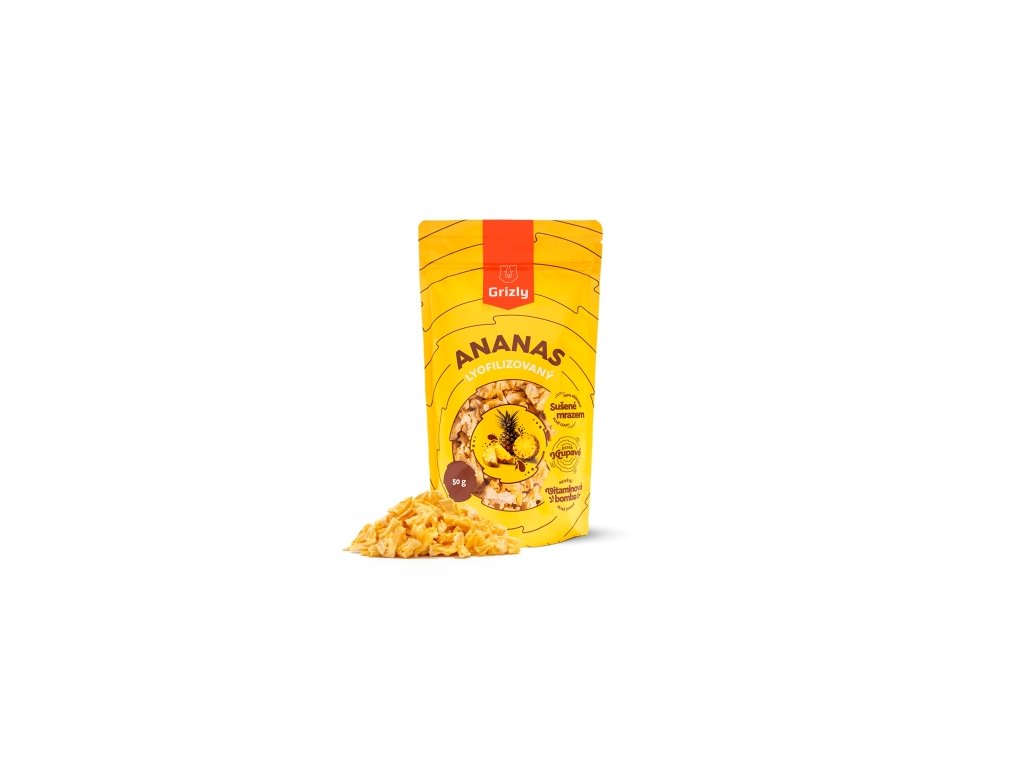 GRIZLY Ananas lyofilizovaný 50 g. Křupavé kousky lyofilizovaného, tedy mrazem sušeného, ananasu byste rozhodně měli ochutnat! A můžete po něm sáhnout klidně v průběhu celého roku, protože díky speciálnímu procesu sušení hlubokým mrazem chutná jako čerstvě sklizený, i když od té chvíle už nějaký ten čas uplynul. Lyo ananas je skvělý jako zdravá svačina na doplnění energie během dne anebo k snídani jako součást kaše. Jestli vás baví zkoušet nové chutě, využijte ho při tvorbě domácích moučníků, přidejte ho do granoly nebo pestrého smoothie. Pokud byste přeci jenom potřebovali víc mrazem sušeného ananasu, máme pro vás připravené XXL balení . Věděli jste, že…. …lyofilizace je proces sušení hlubokým mrazem za velmi nízké teploty a tlaku? Dochází k vysušení přirozeně obsažené vody, proto je lyofilizované ovoce tak křupavé. Navíc si v maximální možné míře zachová svou původní barvu, chuť, vůni a všechny minerální látky a vitamíny. Plno zajímavostí o mrazem sušeném ovoci najdete v našem článku. Tak si ho neváhejte přečíst.Doplňkové parametry