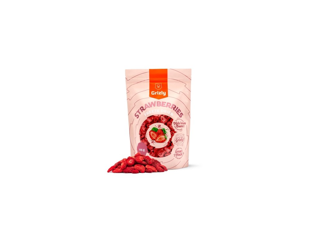 GRIZLY Jahody lyofilizované XXL 125 g. Jakmile naše lyo jahody ochutnáte, už nebudete chtít žádné jiné. Díky šetrnému sušení mrazem jsou GRIZLY lyofilizované jahody plné vitamínů a živin stejně jako čerstvé jahody. Stanou se tak bohatým zdrojem vitamínů nebo vlákniny. Navíc krásně křupou, proces lyofilizace je totiž zbavil vody. A protože je balíme do znovuuzavíratelného obalu, tuto vlastnost si uchovají. Stejné XXL balení, v jakém jsou zabaleny lyo jahody, najdete také u ostatního ovoce sušeného mrazem. Nemusíte se tak bát, že byste ho neměli dostatek. Jestli máte kromě jahod rádi i jiné ovoce, vyzkoušejte oblíbený Lyo mix Šestk a. Uvnitř najdete kousky lyofilizovaných broskví, plátky lyofilizovaného ananasu, lyo mango, banán, maliny a samozřejmě jahody. Pro milovníky čokolády pak máme připravené lyofilizované ovoce v čokoládě. Proč chtít GRIZLY lyofilizované jahody XXL. krásně křupavé 100% přírodní bez přidaného cukru díky lyofilizaci si zachovává svoji původní barvu, chuť i vůni lahodná svačina praktické větší balení Jak lyo jahody využít. Přisypte je do jogurtu, kaše, smoothie nebo proteinu. Lyo jahody také skvěle ochutí ranní müsli či odpolední svačinu. Případně se pusťte do pečení a vykouzlete například famózní Red velvet dort s mascarpone a lyofilizovaným ovocem. Recept na něj najdete tady. Věděli jste, že... …lyofilizace je proces sušení hlubokým mrazem za velmi nízké teploty a tlaku? Dochází k vysušení přirozeně obsažené vody, proto je lyofilizované ovoce tak křupavé. Navíc si v maximální možné míře zachová svou původní barvu, chuť, vůni a všechny minerální látky a vitamíny. Plno zajímavostí o mrazem sušeném ovoci najdete v našem článku. Tak si ho neváhejte přečíst.Doplňkové parametry