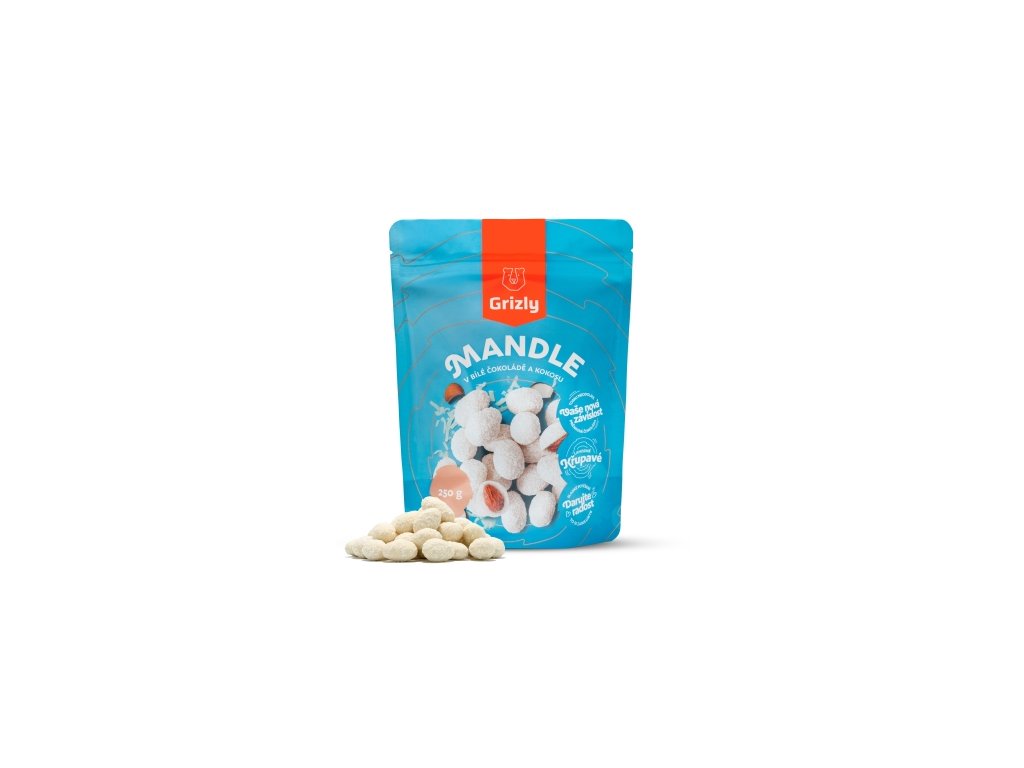 GRIZLY Mandle v bílé čokoládě s kokosem 250 g. Nebe v puse! Vážně! Ne nadarmo jsou mandle v bílé čokoládě s kokosem zabaleny v nebesky modrém balení. Jakmile ho otevřete a ochutnáte sněhově bílou mandli, budete se cítit, jako byste se vznášeli na obláčku ... Na obláčku z bílé čokolády a kokosu! Jestli se řadíte mezi milovníky sladkého, neváhejte ani vteřinu, mandle obalené v poctivé vrstvě bílé čokolády posypané kokosem jsou pro vás tím pravým ořechovým. Vychutnat si je můžete jen tak, nicméně doporučujeme přidat pár kousků do ještě horké snídaňové kaše. Čokoládová poleva se v ní totiž nádherně rozteče a učiní tak z kaše opravdu královsky dobrou snídani. A protože sladkých mandlí není nikdy dost, doporučujeme ochutnat ještě mandle v mléčné čokoládě se skořicí nebo mandle v jogurtové polevě. Proč chtít GRIZLY mandle v bílé čokoládě s kokosem. oříšková delikatesa bez palmového oleje skvělé jen tak na chuť, případně jako sladký dárekDoplňkové parametry