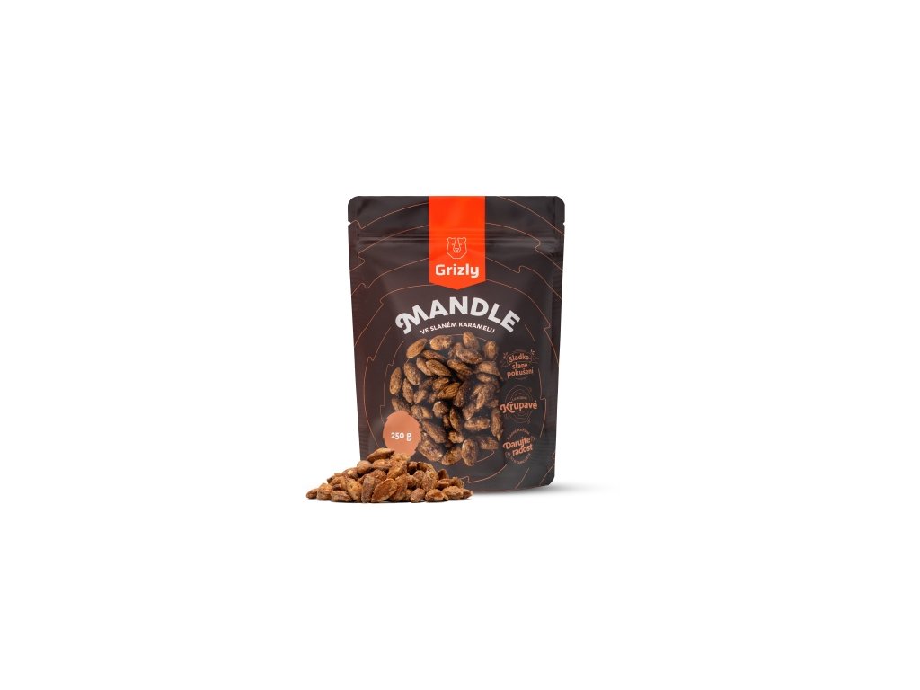 GRIZLY Mandle ve slaném karamelu 250 g. Nezaměnitelná chuť slaného karamelu ve spojení s praženými mandlemi? My říkáme jednoznačné ano! Ruku na srdce, každý si rád čas od času zamlsá, a když mlsná jednoho dne dožene i vás, hodí se mít po ruce třeba právě naše mandle ve slaném karamelu. Samy o sobě samozřejmě chutnají famózně, ale chybu neuděláte ani tehdy, když se je rozhodnete jimi vylepšit třeba svoji snídaňovou kaši. Navíc jsme je zabalili do krásného znovuuzavíratelného obalu, takže budou po ruce, kdykoli to bude třeba. Kdo by rád zkusil ještě nějaké další ochucené mandle, určitě mu nesmí uniknout GRIZLY Mandle v mléčné čokoládě se skořicí nebo GRIZLY Kokosové mandle v bílé čokoládě. Proč chtít GRIZLY mandle ve slaném karamelu. jedlý dárek pro milovníky ořechů doladí k dokonalosti kdejakou snídaňovou kaši zabaleny v praktickém znovuuzavíratelném baleníDoplňkové parametry