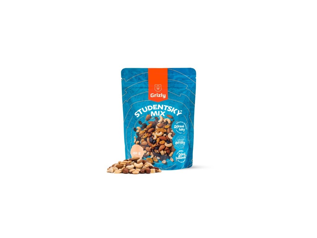 GRIZLY Studentská směs 250 g. Osvědčená kombinace mandlí, arašídů, rozinek, kešu, ananasu a lískáčů dělá ze studentské směsi Grizly skvělou rychlou svačinku. V našem mixu najdete ideální poměr oříšků a sušeného ovoce. Tato lahodná kombinace dodá vašemu tělu potřebné živiny a povzbuzení, ať už jste student, nebo ne. Díky praktickému znovuuzavíratelnému sáčku, ve kterém je studentská směs zabalena, ji budete mít vždy po ruce – ať už vás přepadne chuť během přednášky, nebo si ji ráno nasypete do müsli či kaše. Co najdete ve studentském mixu? Neloupané mandle Kešu oříšky Lískové ořechy Rozinky Arašídy Sušený ananas Proč chtít GRIZLY studentskou směs. zabalená v praktickém znovuuzavíratelném balení famózně křupavá kombinace ideální rychlá svačina Věděli jste, že…. …směsi oříšků si sami vyrábíme v malých šaržích tak, aby vám suroviny přišly v co nejčerstvější podobě? Na kvalitě si dáváme záležet, a proto do směsí přidáváme pouze oříšky, které balíme také samostatně jako exkluzivní produkt.Doplňkové parametry