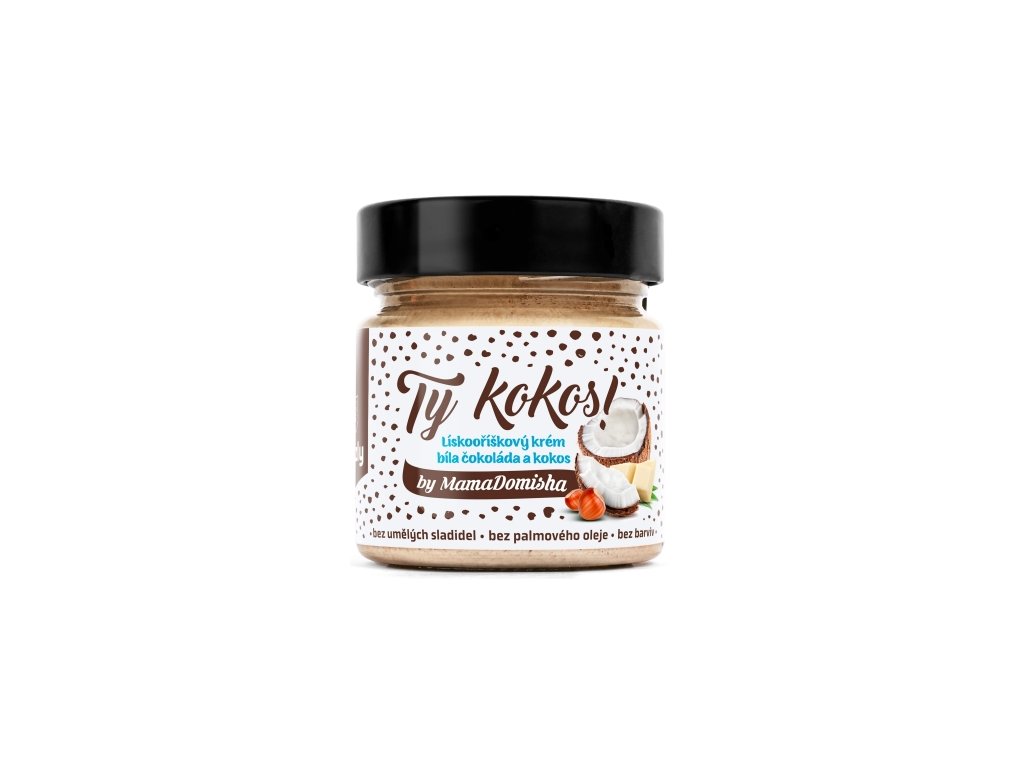 GRIZLY Ty kokos! by @mamadomisha 250 g. Ty kokos! je splněný sen všech milovníků lískových oříšků, kvalitní bílé čokolády a strouhaného kokosu. To vše navíc zalité pořádnou vrstvou výborné mléčné čokolády. Neváhejte a ochutnejte jedinečnou delikatesu ve skleničce. Lískooříškový krém Ty kokos! se hodí k ochucení vaší ranní kaše, na lívance, k pečivu nebo jen tak na lžičku. Nezapomeňte vyzkoušet také další produkty by @mamadomishaDoplňkové parametry