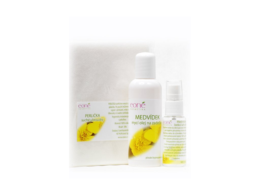 Ubrousek PERLIČKA navlhčete emulzí z hydrofilního oleje Medvídek a očistěte zadeček. U děvčátek vytíráme při každodenní hygieně zažloutlý mázek mezi stydkými pysky směrem odpředu dozadu. Roztok je také možné nastříkat přímo na čištěné místo a to pak otřít.