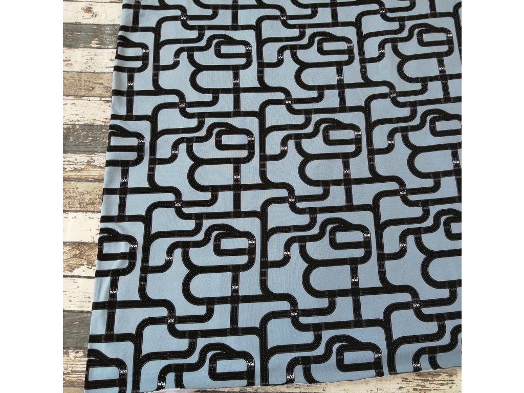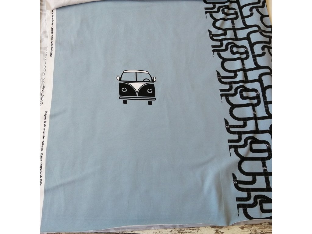 Rozměr: asi 150 x 75 cm. Jedná se o celou šíři látky, kdy na jedné třetině šíře je motiv auta na modrém podklady a na zbylých dvou třetinách jsou cestičky.