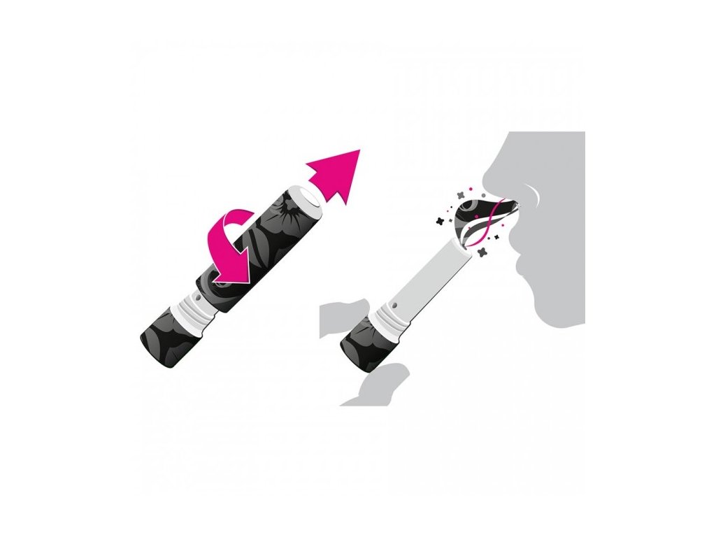 Návod na použití: Inhalátor jednoduše otevřete pootočením závitu, přiložíte k nosu a nasajete vůni.