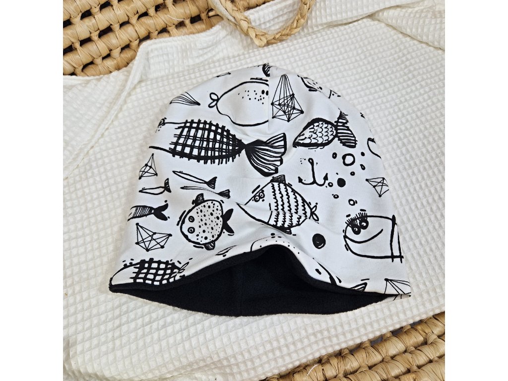 Šmoulí čepička Yháček, Ryby na ecru, flís, vel. XL