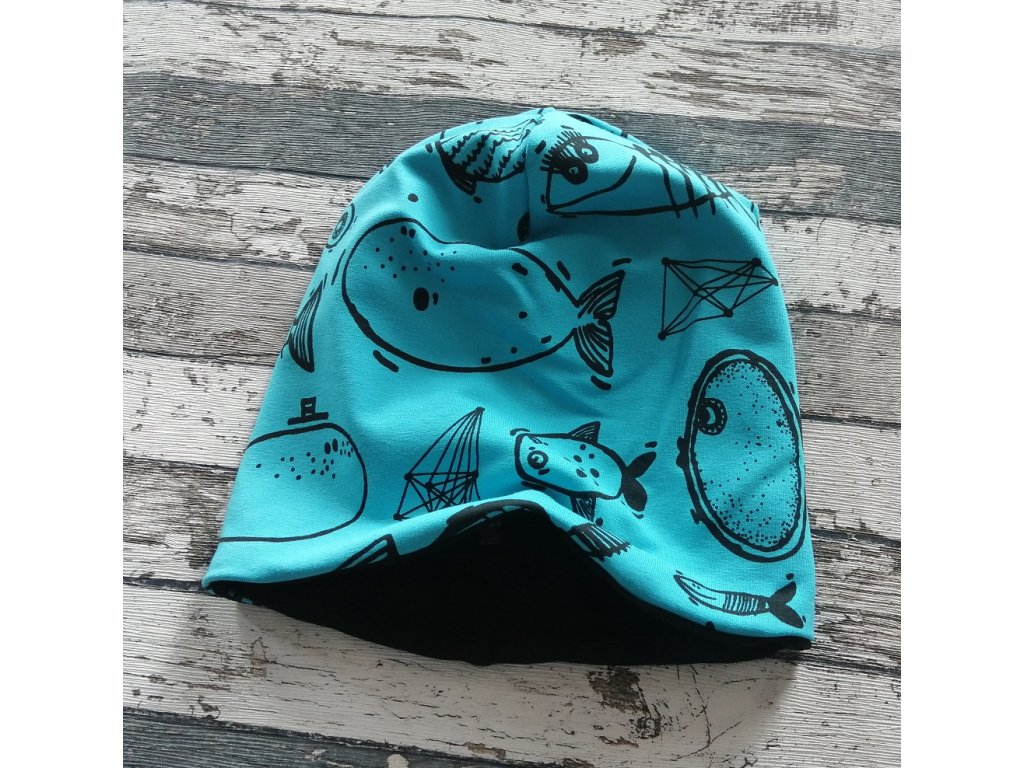 Šmoulí čepička Yháček, oboustranná, Ryby na tmavém tyrkysu