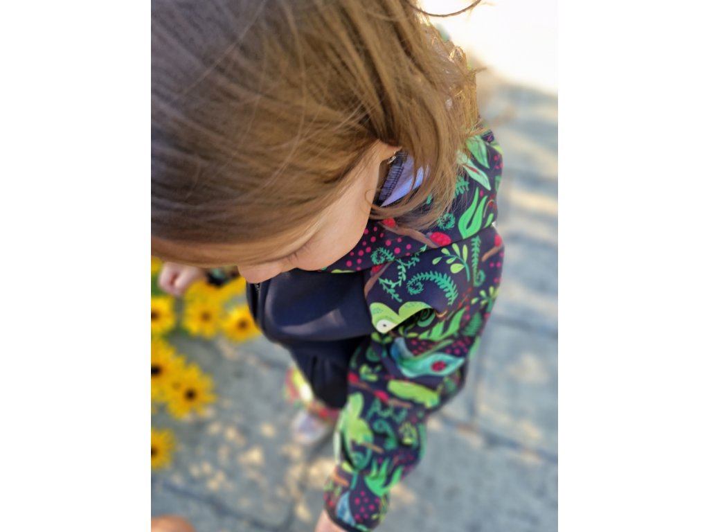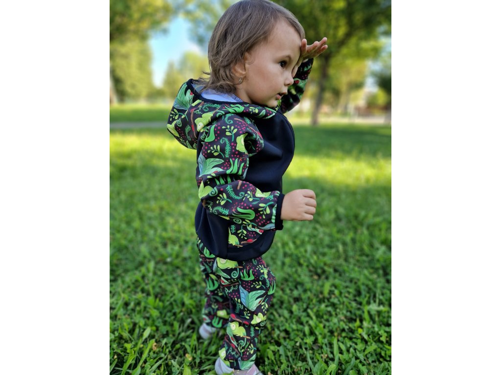 Funkční bunda Yháček, z vnější strany je nepromokavá, odolná proti větru, vhodná i do deště. Bunda má kapsy a kapucku. Je lemovaná pruženkou, lehce nabíranou, aby se vítr nedostal k dítěti.