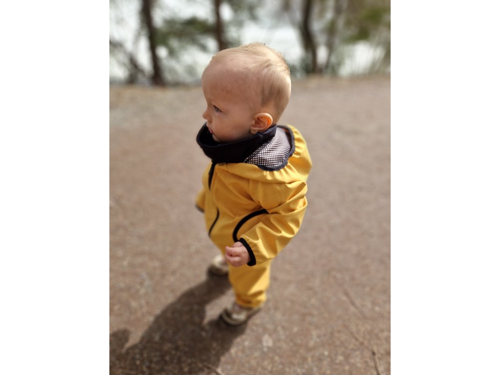 Funkční bunda Yháček, z vnější strany je nepromokavá, odolná proti větru, vhodná i do deště. Bunda má kapsy a kapucku. Je lemovaná pruženkou, lehce nabíranou, aby se vítr nedostal k dítěti.