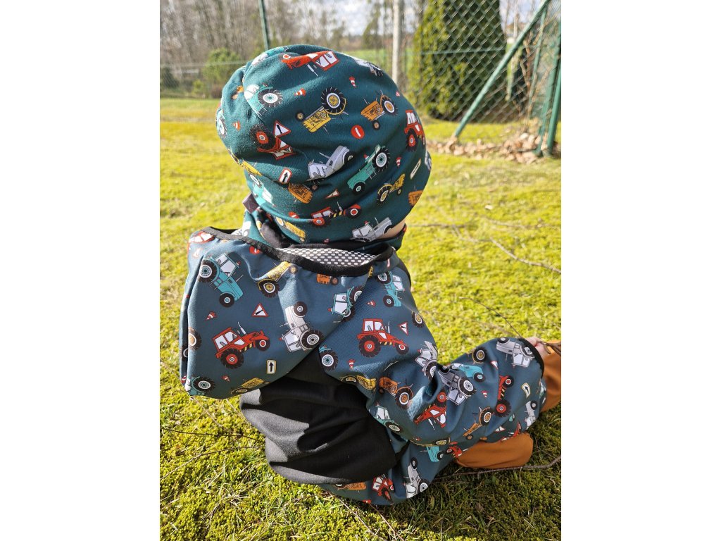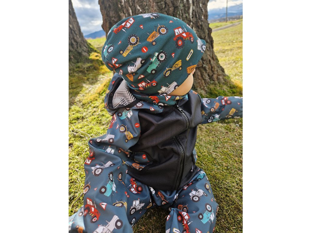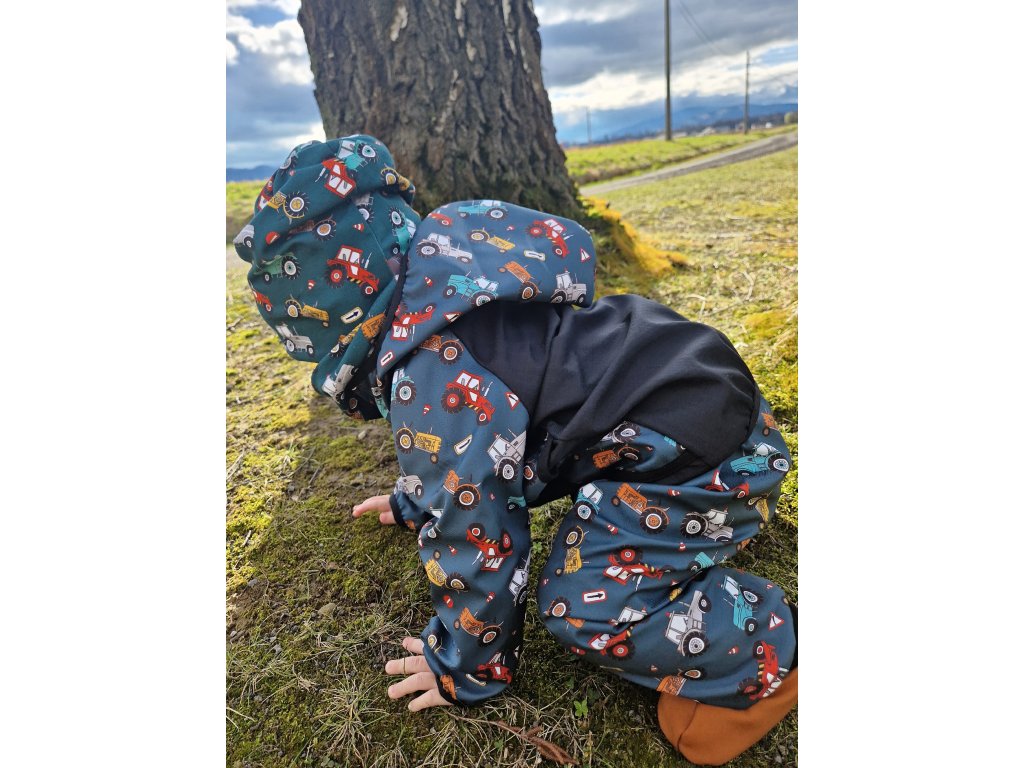Funkční bunda Yháček, z vnější strany je nepromokavá, odolná proti větru, vhodná i do deště. Bunda má kapsy a kapucku. Je lemovaná pruženkou, lehce nabíranou, aby se vítr nedostal k dítěti.