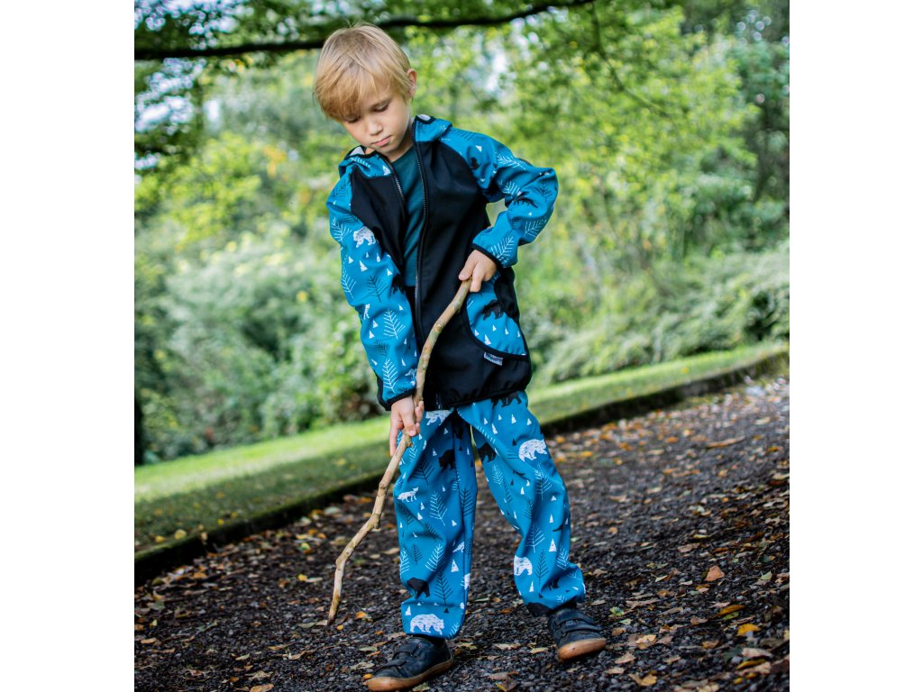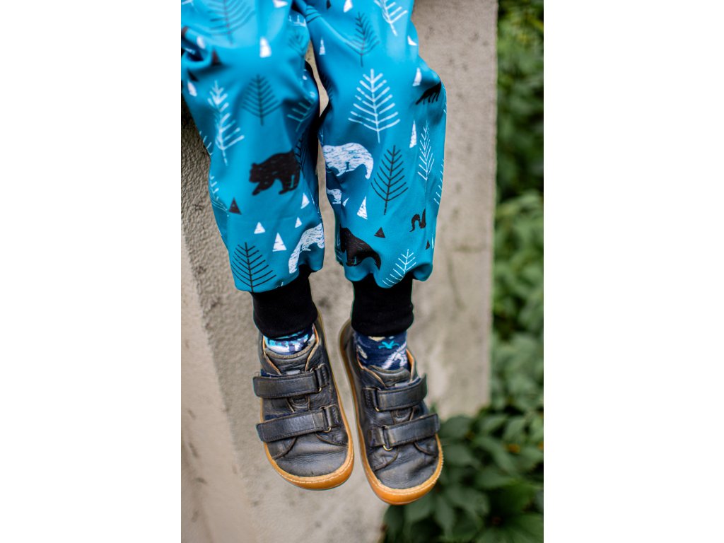 Funkční kalhoty z nepromokavého a větruvzdorného softshellu. Sedí dětem s látkovou i jednorázovou plenou. Jsou pohodlné, náplety v pase a na nožkách je možné zahnout.