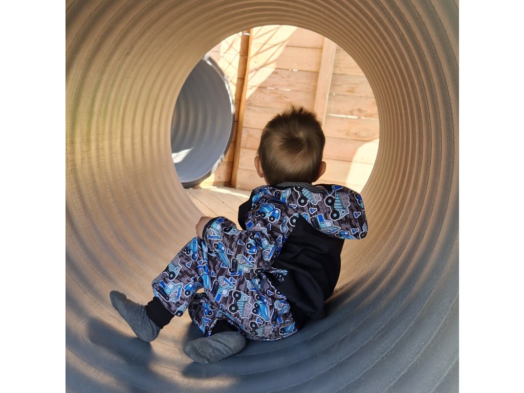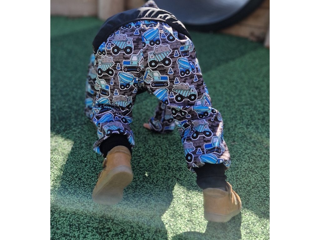 Funkční kalhoty z nepromokavého a větruvzdorného softshellu. Sedí dětem s látkovou i jednorázovou plenou. Jsou pohodlné, náplety v pase a na nožkách je možné zahnout.