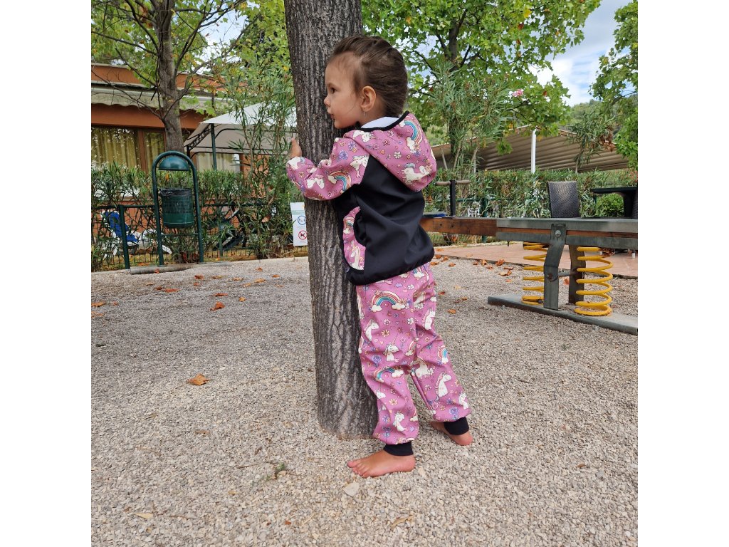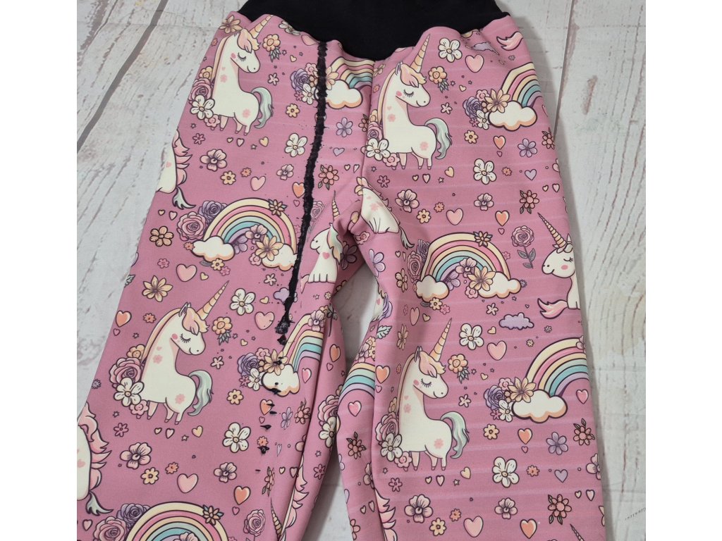 Zimní softshellové kalhoty Yháček, jednorožci na starorůžové, vel. 98, II. jakost