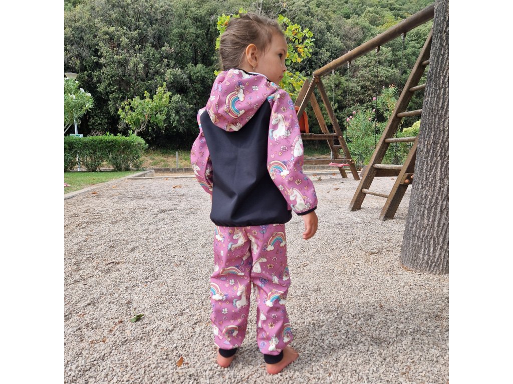 - Pozor, softshell (nejen ten náš) má sice nepropustnou membránu, ale není všemocný. Pokud dítě posadíte do kaluže, kalhoty mohou promoknout přes švy. Sníh a déšť zvládnou bez problémů.