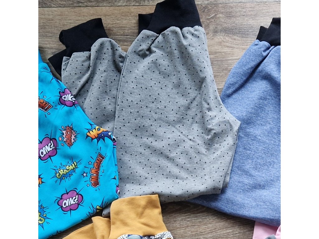 Oblíbené tepláčky Yháček 2 v 1. Mají široké náplety v pase a u kotníčků. Náplety se dají zahnout, tím se zmenší velikost. Když začnou být tepláčky krátké, dají se nosit jako tříčtvrťáčky. Díky tomu vydrží mnohem déle, než jakékoli jiné tepláky. Krásně sedí na jednorázové i látkové pleny. Volnější střih se sníženým sedem pro dokonalé pohodlí novorozence i batolete.