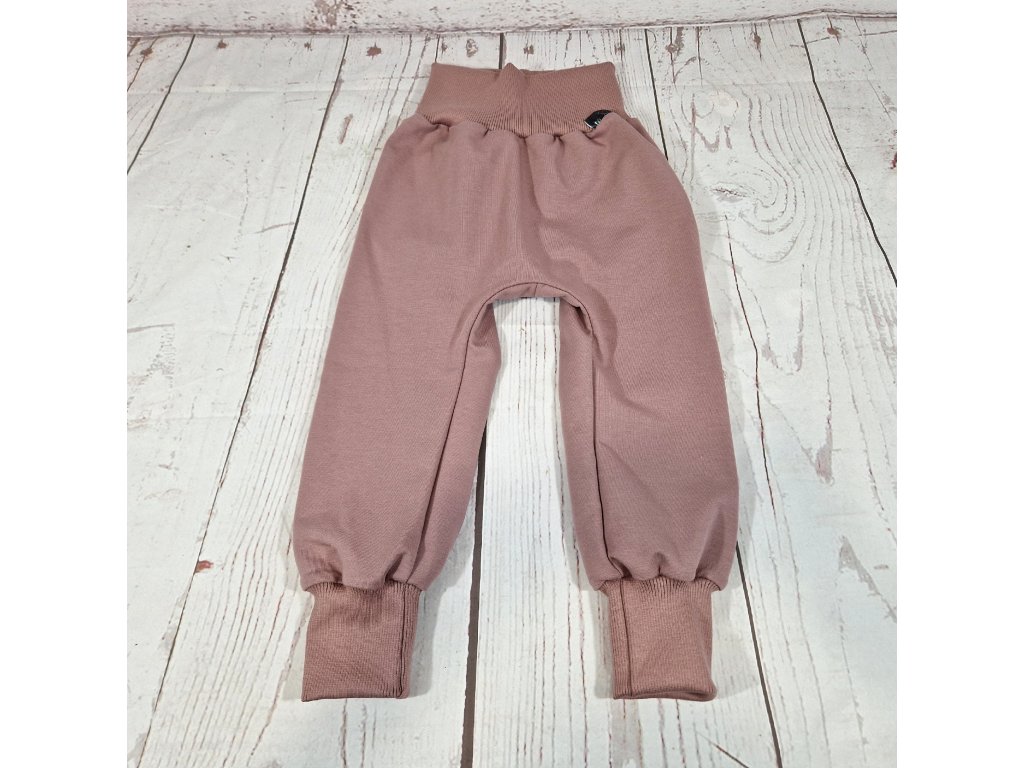 Od velikosti 104 šijeme tepláčky se švem v rozkroku (užší střih). Lépe sedí dětem bez plen, ale plena se do nich vleze také.