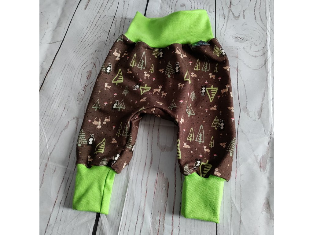 Oblíbené tepláčky Yháček 2 v 1. Mají široké náplety v pase a u kotníčků. Náplety se dají zahnout, tím se zmenší velikost. Když začnou být tepláčky krátké, dají se nosit jako tříčtvrťáčky. Díky tomu vydrží mnohem déle, než jakékoli jiné tepláky. Krásně sedí na jednorázové i látkové pleny. Volnější střih se sníženým sedem pro dokonalé pohodlí novorozence i batolete.