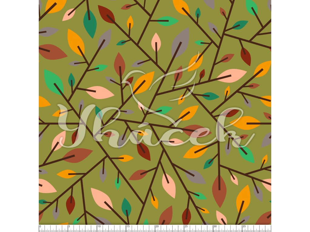 Zakázkový tisk, softshell, kočárkovina... Geometrické lístky na olivové
