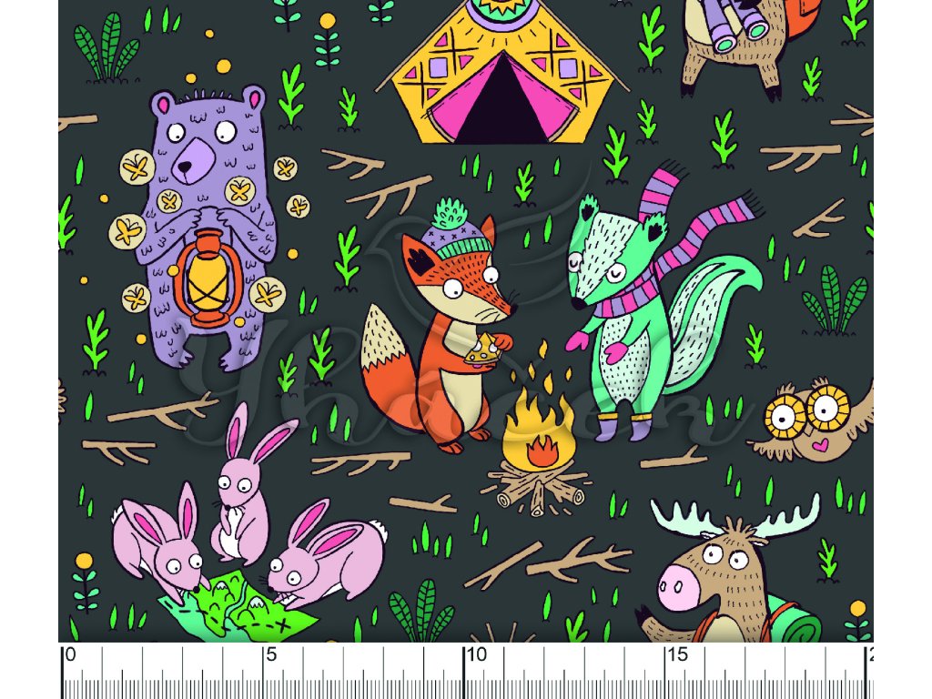 Zakázkový tisk, softshell, kočárkovina... Kempující zvířátka na šedé