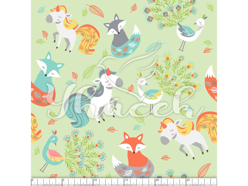 Zakázkový tisk, softshell, kočárkovina... Lišky, jednorožci a pávi na zelenkavé