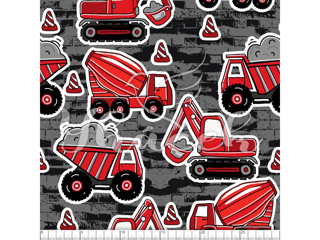 Zakázkový tisk, softshell, kočárkovina... Stavební stroje červené