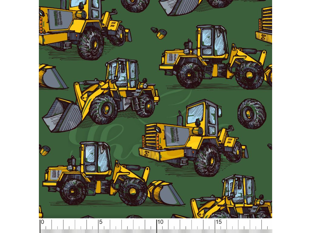 Zakázkový tisk, softshell, kočárkovina... Stavební stroje na khaki