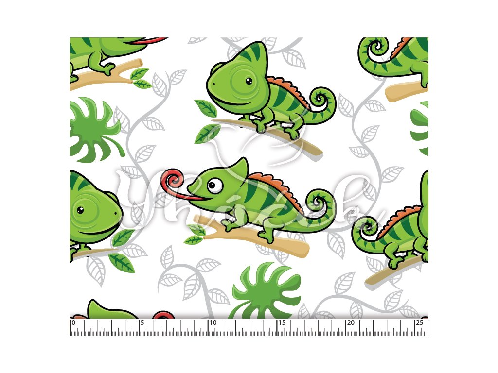 Zakázkový tisk, softshell, kočárkovina... Veselí chameleoni na bílé