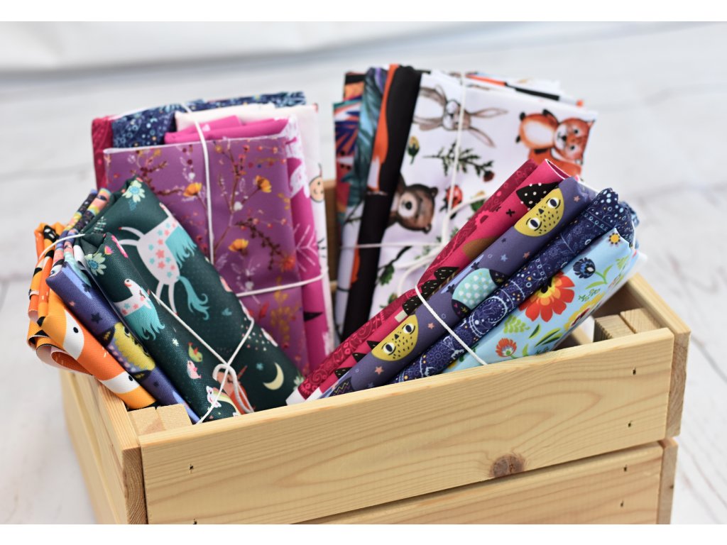 MYSTERY PACK - tajemný balíček látek. Menší kusy o plné šíři. Dohromady cca metr látek. Balíček obsahuje 3-6 různých vzorů, kousky mají 10-60 cm o šíři cca 150 cm.